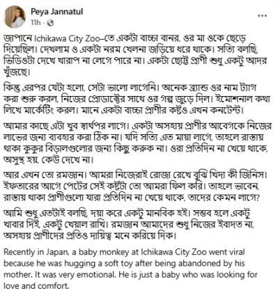 ভিডিওটিতে দেখা যায়, মা বিহীন ছোট্ট বানরটি একটি নরম খেলনাকে পরম মমতায় আঁকড়ে ধরে আছে। দৃশ্যটি ছুঁয়ে গেছে মডেল, আইনজীবী ও অভিনেত্রী পিয়া জান্নাতুলকেও। তবে এই অসহায়ত্বকে পুঁজি করে বিভিন্ন ব্র্যান্ডের প্রচারণার কৌশলে ক্ষোভ প্রকাশ করেছেন তিনি।
