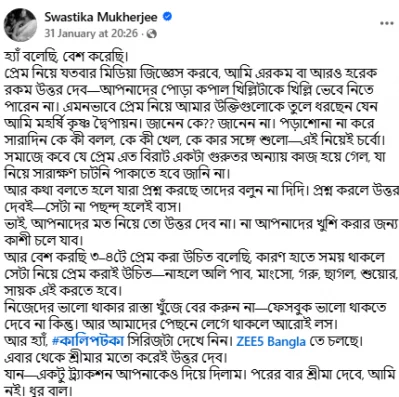 সমালোচকদের পড়াশোনা নিয়ে প্রশ্ন তুলে স্বস্তিকা লেখেন, ‘জানেন মহর্ষি কৃষ্ণ দ্বৈপায়ন কে? জানেন না। পড়াশোনা না করে সারাদিন কে কী বলল, কে কী খেলো, কে কার সঙ্গে শুলো—এই নিয়েই চর্চা।’
